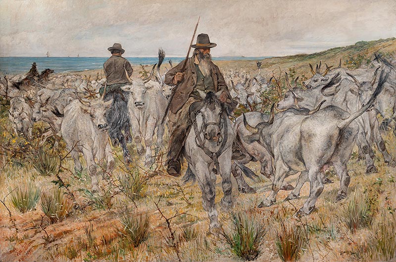 La mostra è imperdibile per gli amanti della natura toscana, immortalata da Giovanni Fattori in dipinti che raffigurano la campagna e il mare nella loro sfolgorante bellezza, e il fermento di un periodo storico attraverso l’umanità dei suoi protagonisti. Opere come Lungomare di Antignano riflettono la bellezza della terra toscana con il mare che si estende sino all’infinito. L’occhio del fruitore viene trasportato verso l’orizzonte dove una barca a vela culla il pensiero che si fa sogno. Il calore dell’estate è reso magistralmente attraverso colori caldi, macchie, ombre, sembra quasi di sentire il profumo del fieno appena falciato in opere quali Pagliaio, dove è un covone di fieno il protagonista assoluto del quadro, a evocare la fatica del contadino che, a fine giornata, non è presente nel dipinto in quanto è andato a riposare. L’essenza della vita contadina, intrisa di sudore, è tutta lì, in quel campo arato, in quel covone solitario che pare ricordare il profilo di un contadino stanco. Una vita intrisa di fatica si riflette anche nei ritratti quali Il buttero, dal volto segnato ma dagli occhi di un azzurro scintillante che rispecchiano un carattere forte e la fierezza di un uomo attaccato alla sua terra. Mandria maremmana racchiude in un quadro il duplice aspetto della vita. Mentre in primo piano i butteri guidano la mandria di buoi, lavorando alacremente, sullo sfondo il mare evoca un senso di fuga e di libertà, grazie alle barche a vela che si lasciano trasportare dal vento.