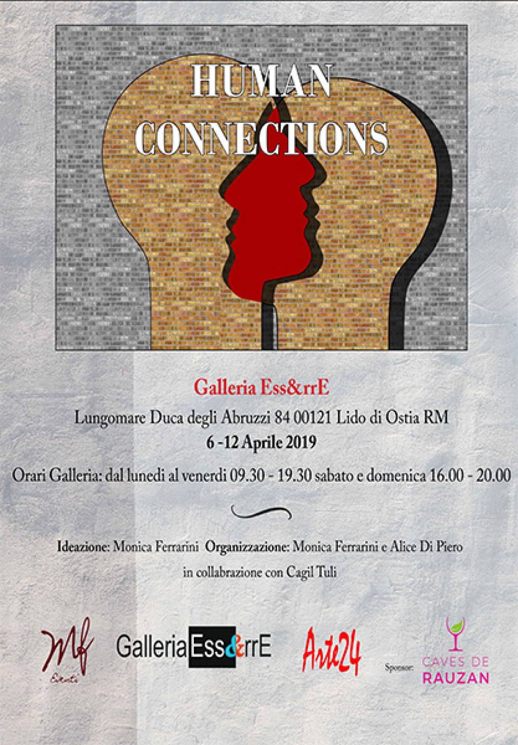 Verrà inaugurata sabato 6 aprile alle ore 17 la mostra di arte contemporanea dal titolo “Human Connections” presso la Galleria Ess&rrE al Porto turistico di Roma. L’evento è ideato e organizzato da Monica Ferrarini e Alice Di Piero con la collaborazione di Cagil Tuli. In occasione del vernissage sarà presente la trasmissione televisiva Arte 24 e verrà offerta una degustazione di vini dell’azienda vinicola francese Caves de Rauzan.