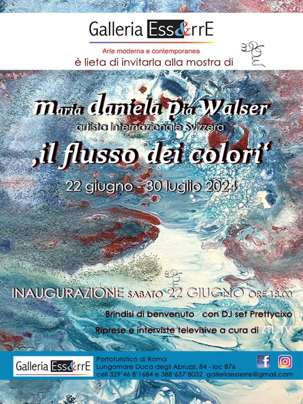Il tema tanto caro all’autrice sta ai colori come il “flusso”, scaturito dalla capace maestria di Maria Daniela Pia, sceglie come aggrapparsi alla tela nel miglior modo possibile e plasmare un’opera che riesce a trasmettere con la totale immediatezza quel fascino proprio delle opere della Walser. Nelle precedenti mostre alla Galleria Ess&rre le sue opere hanno suscitato tantissimo interesse ed è proprio questo che ha dato la spinta a proporre nuovamente ai nostri amici, collezionisti e amanti dell’arte, le opere della Walser.