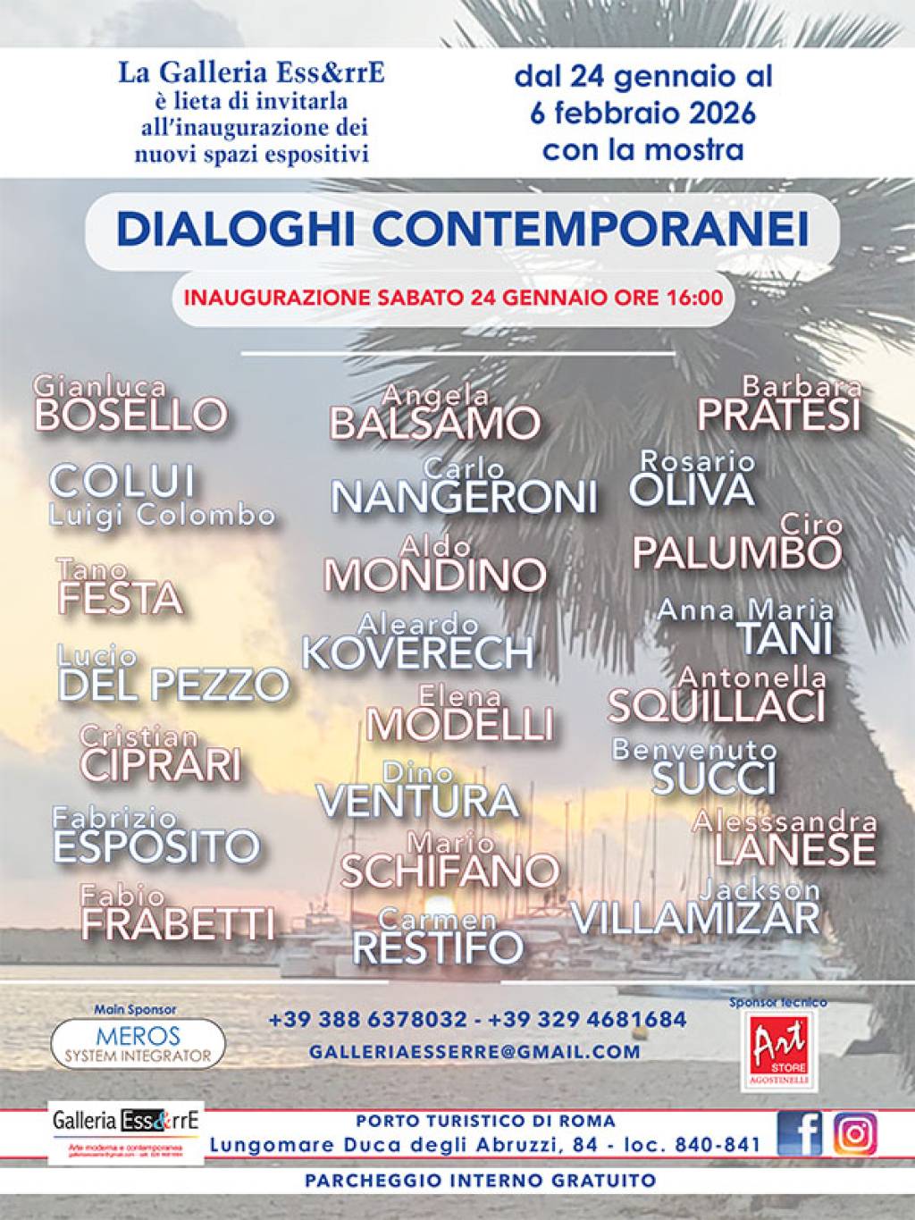 L’apertura dei nuovi bellissimi e prestigiosi spazi della Galleria Ess&rrE al Porto Turistico di Roma con la mostra “DIALOGHI CONTEMPORANEI” segna un passaggio significativo nel rapporto tra arte contemporanea e territorio. In un luogo naturalmente votato al transito, all’orizzonte e all’incontro, la galleria sceglie di insediarsi come presidio culturale stabile, capace di trasformare il porto da semplice infrastruttura a spazio di pensiero, visione e confronto.