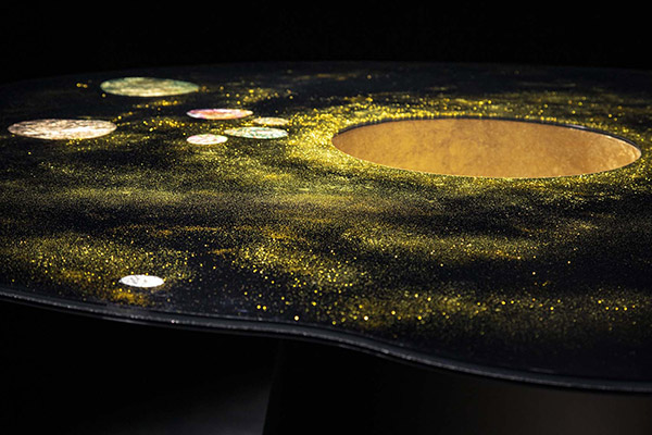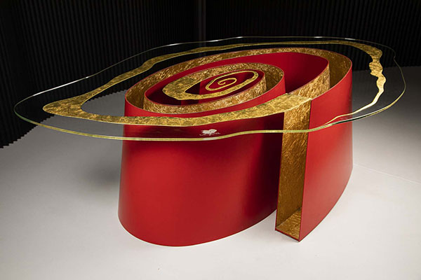 L’unicità è dovuta ad un approccio sperimentale che prima di tutto riguarda la grafica, il disegno del decoro, punto di partenza che determina e guida la forma di tutta la creazione (e non viceversa). La grafica del piano si armonizza poi con il disegno scultoreo del basamento, nel caso di tavoli, o delle strutture, se si tratta di trittici o di testate per letti. Il risultato è un prodotto percepito non come composto da più elementi ma come un unico “arredo artistico”.