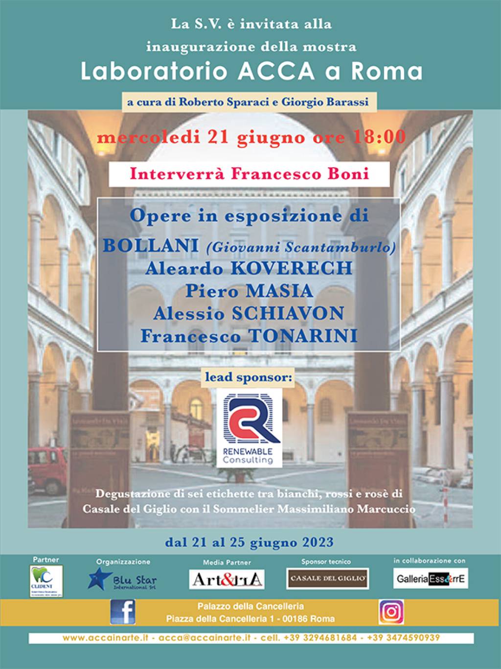 Nelle prestigiose mura del Palazzo della Cancelleria Vaticana a Roma, mercoledì 21 giugno si inaugura la mostra Laboratorio Acca a Roma. Scelti tra gli artisti di Laboratorio Acca, la trasmissione televisiva della domenica sera dalle 21 a mezzanotte, in onda sui canali di Arte Investimenti TV, cinque artisti italiani espongono i loro lavori più significativi.