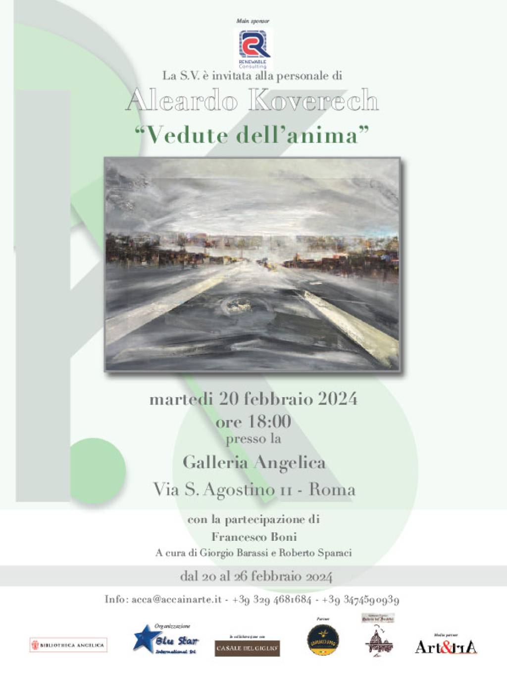 La mostra sarà inaugurata alla Galleria Angelica di Via di Sant Agostino 11, nel cuore della Roma rinascimentale, martedì 20 febbraio 2024 alle ore 18.00 e rimane aperta al pubblico fino al 26 febbraio. Ingresso libero, catalogo in galleria.