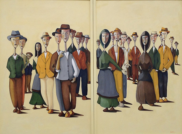 Guerre, morte, carestie, senso di impotenza, mancanza di valori e obiettivi, stanno rubando all’universo i suoi colori rendendolo monocolore, nascondendo ciò in cui l’uomo si identificava, “IL CREATO”. Da qui gli sfondi monocromatici che evidenziano il senso di “SMARRIMENTO” sia della natura MATER MAGISTRA sia dell’uomo, dentro i quali le figure si muovono sole o in gruppo, senza un “PUNTO DI ARRIVO”. Umanità e natura, procedono smarriti verso uno sterile “NON SI SA BEN COSA” privi di un obiettivo, un fine comune, immersi in un paesaggio vuoto, monocolore senza appigli, quasi infernale. Di tutto ciò si nutre IL VUOTO UNIVERSALE dove il TUTTO DIVIENE IL NULLA DI TUTTO.Centrale per la mia ricerca è il colore che pone le basi per liberare il tutto dal grigiore Universale e riaccendere le speranze per un ritorno alla vita vera dove l’uomo vivrà la propria metamorfosi abbandonando il suo status di MARIONETTA per riappropriarsi della sua VERA FORMA IDENTITARIA, dove con gli ALTRI e con la NATURA ritroverà interessi comuni ed un obbiettivo finale che al momento i miei attori non intravedono. Questi miei COLLI LUNGHI E SOTTILI differiscono dai colli di Modigliani in quanto il grande artista, a me sembra voglia sottolinearne una profon- da ed elegante inquietudine. Con questi voglio evidenziare non la VANITÀ non un’INQUIETUDINE ma la VOLONTÀ di soddisfare il bisogno di vedere più lontano per trovare risposte oltre il confine di questa AVVILENTE ANORMALITÀ. Guardare dall’alto, come marinai, cercando di intravedere un futuro, lasciando sul fondo, senza mai dimenticarle, le miserie di un’umanità che non ha ASPETTATIVE. Il colore sarà l’unica vera forza con la quale la luce riemergerà dal buio.