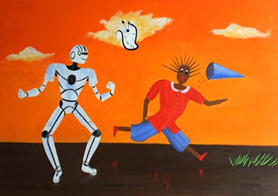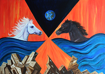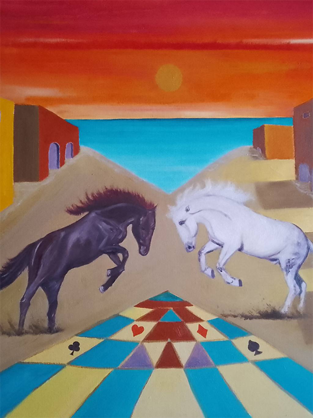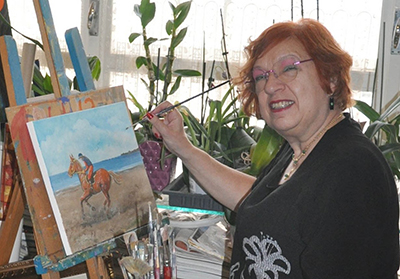 Saranno esposte opere che racchiudono un trentennio di attività, spaziando dal figurativo al simbolismo di timbro sociale. Numerosi i paesaggi agresti e marini, senza dimenticare scorci del Piemonte, affiancati da dipinti che toccano i temi scottanti dell’attualità. Tra le tematiche affrontate da Silvana Gatti troviamo le migrazioni, il suo ormai iconico bimbo in provetta, gli ufo, l’intelligenza artificiale e, infine, l’auspicio della pace nel mondo. Opere come “Il nuovo Ulisse”, recentemente selezionata dal Prof. Giammarco Puntelli per una mostra presso Palazzo Avogadro di Sarezzo (Brescia), raccontano l’epopea dei profughi odierni che, in fuga dalle guerre o per via dei cambiamenti climatici, si spingono per migliaia di chilometri verso paesi più sicuri alla ricerca di un futuro migliore. “Alla ricerca dell’identità”, dipinto menzionato da Vittorio Sgarbi, racconta di un uomo in viaggio alla ricerca di se stesso, in bilico tra una sponda e l’altra del Mare Nostrum. “L’urlo di Pinocchio” parla dell’intelligenza artificiale, attraverso un robot umanoide posto a confronto con il Pinocchio di collodiana memoria che, impaurito, scappa da un futuro invadente. Anche “Vita moderna” vede un robot a colloquio con un bambino che, chiuso tra le mura di casa, non guarda al di là della finestra dove, invece, c’è la vita reale. Particolare è “La creazione del robot”, in cui la Gatti prende in prestito la divina mano michelangiolesca della Cappella Sistina affinché dia vita ad un robot. Con “La perdita della ragione” Silvana Gatti riprende il mito della biga alata di Platone. Qui cavallo nero e cavallo bianco si scontrano in quanto hanno perso la biga, simbolo della ragione che ha abbandonato i fautori delle guerre che insanguinano il mondo. Stessa tematica la ritroviamo in “Rivalità”. In mostra anche opere raffiguranti il bimbo in provetta, come “La clonazione del faraone”, tematica affrontata in passato dall’artista alludendo alla fecondazione in vitro e alla clonazione umana. Accanto a queste tematiche sociali, non mancheranno dipinti che faranno sognare un ritorno alla natura, come tramonti sul mare, campi di lavanda, papaveri e girasoli.