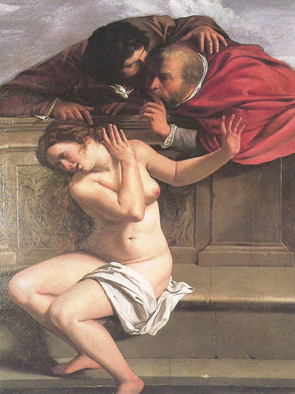 La sua Susanna è nuda, pura, bella, senza gioielli, solo un povero panno si appoggia sulla sua coscia, non la circondano né ricchi vestiti, né preziosi oggetti di toeletta. Sono, invece, riccamente abbigliati i due uomini che incombono su di lei dall’alto, come i paesi a nord dello Stato Pontificio che si sono staccati dalla Chiesa di Roma. I due giudici non sembrano mirare al suo corpo, ma alle sue orecchie e alla sua mente, come gli eretici e i riformisti. Le morbide natiche di Susanna poggiano su una panca di chiesa, una dura, semplice panca lignea definita da più linee che tagliano orizzontalmente la tela e che si estendono oltre i confini della stessa. Questa panca, che non inizia né finisce, suggerisce l’idea di una Chie-sa illimitata nel tempo e nello spazio. Dietro la scelta di Artemisia di cambiare collocazione rispetto al testo biblico c’è forse il suggerimento del Furiere del Papa, amico di famiglia e suo padrino?