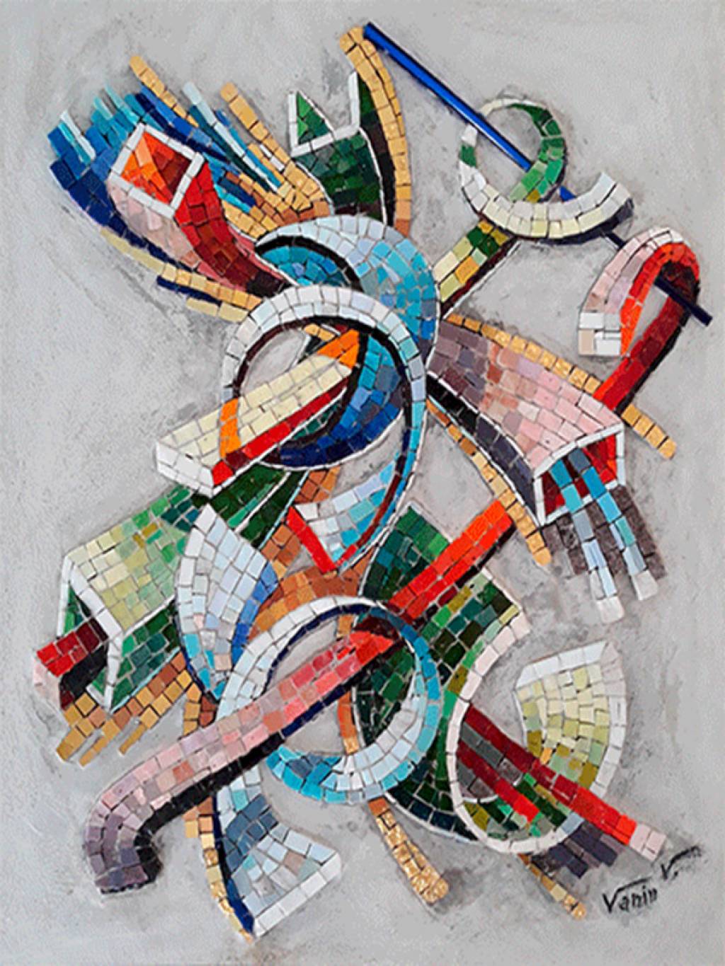 Qualche anno fa ebbi l’occasione fortunata di conoscere Vincenzo Vanin, artista di fama internazionale, in occasione di una rassegna svoltasi presso le Ex-Scuderie delle Tesoriera a Torino. Sempre affascinata dall’arte musiva della basilica di San Marco a Venezia, legata sia alle gusto occidentale dello stile gotico sia alle influenze orientali bizantine, e dai mosaici della basilica di Aquileia, rimasi molto colpita nel vedere i mosaici di grande dimensione di Vanin, medium espressivo che ancora oggi rappresenta la cifra stilistica con cui l’artista esprime la sua creatività attraverso un percorso imperniato sulla potenza cromatica e gestuale, accostando un mestiere antico ad uno stile totalmente moderno. Un artista di questo calibro non si improvvisa, ma nasce dalla lezione dei maestri dell’Istituto Statale d’Arte di Venezia, dagli insegnamenti di Angelo Gatto fino alle esperienze accanto ad Emilio Vedova.